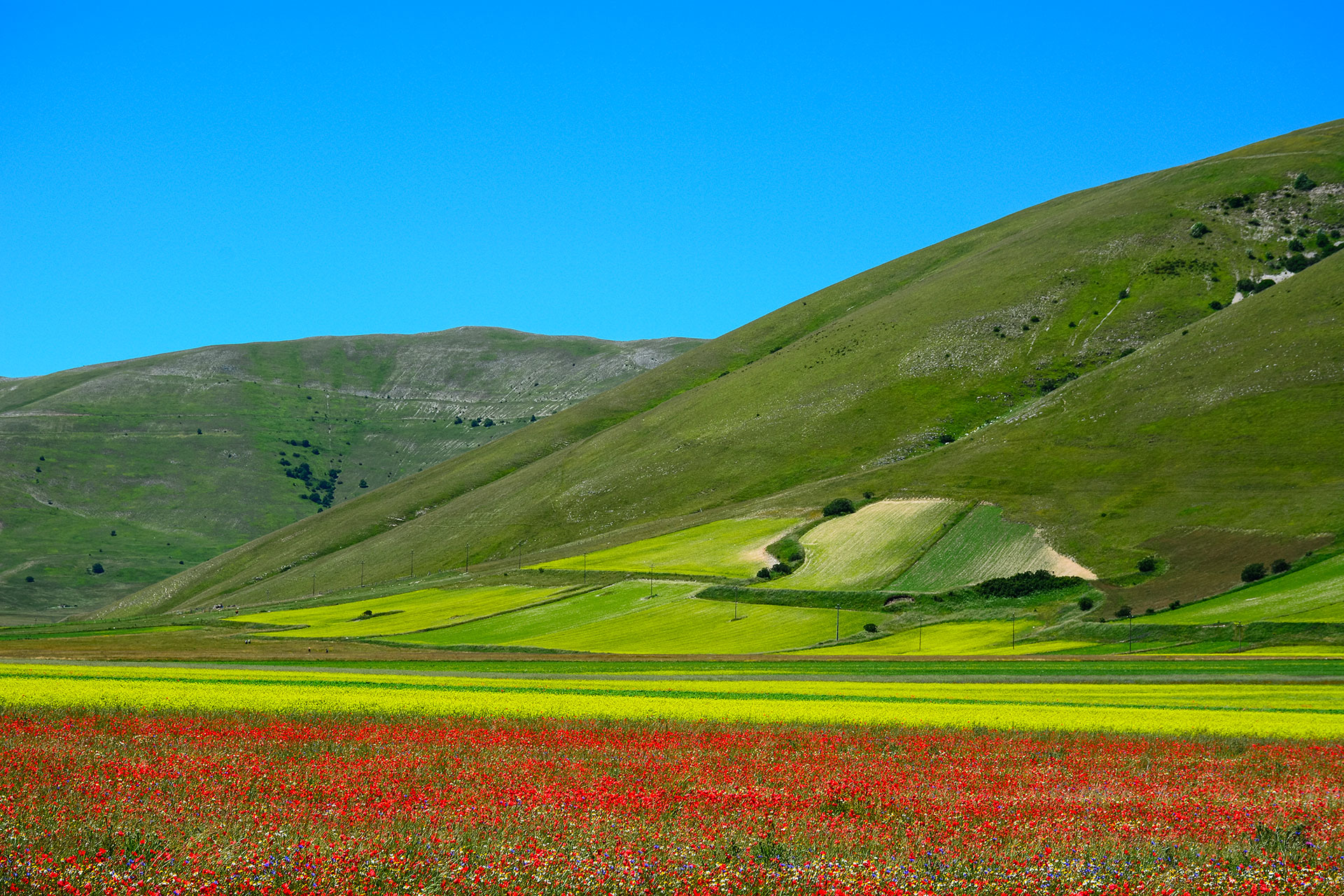 Le specie floreali che tingono il Pian Grande e il Pian Perduto a Castelluccio nei mesi di giugno e luglio sono innumerevoli: camminando lungo i sentieri si possono incontrare genzianelle, narcisi, violette, papaveri, ranuncoli, asfodeli, viola Eugeniae, trifogli, acetoselle e tant’altro. La fioritura della lenticchia è attesa da maggio a luglio regalando uno straordinario spettacolo in cui la monotonia cromatica del pascolo viene spezzata da un mosaico di colori, con variazioni di toni che vanno dal giallo ocra al viola, al rosso ed al blu. A fine giugno si tiene la festa della fioritura delle lenticchie, chiamata “LA FIORITA”, che non deve essere confusa con la fioritura vera e propria che, essendo un fenomeno naturale, è imprevedibile e dura appunto per diverse settimane.